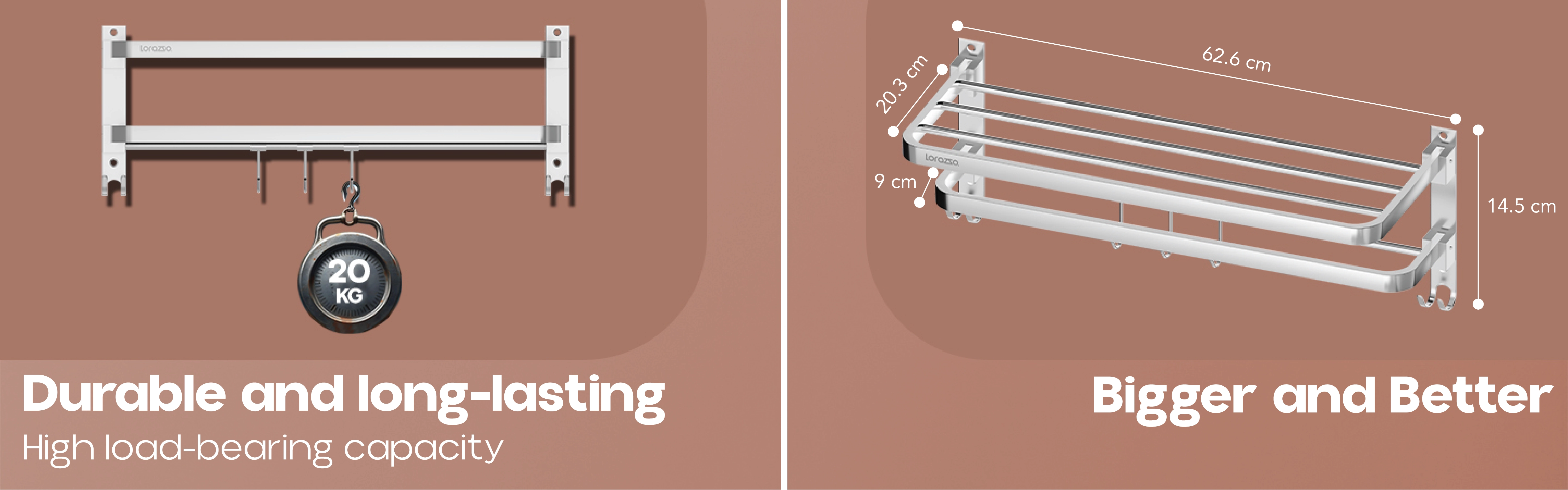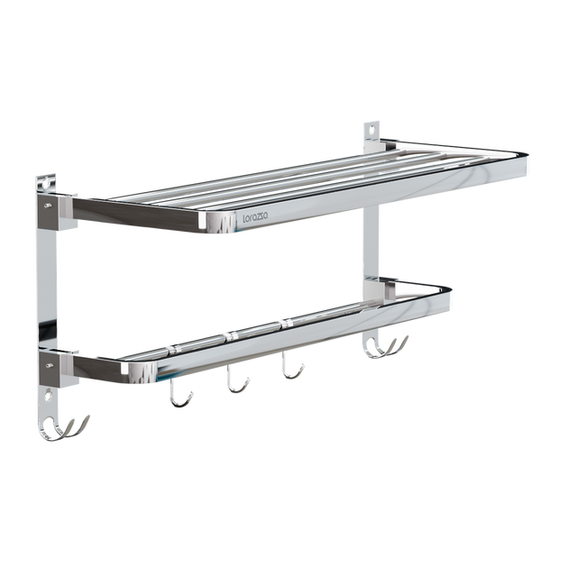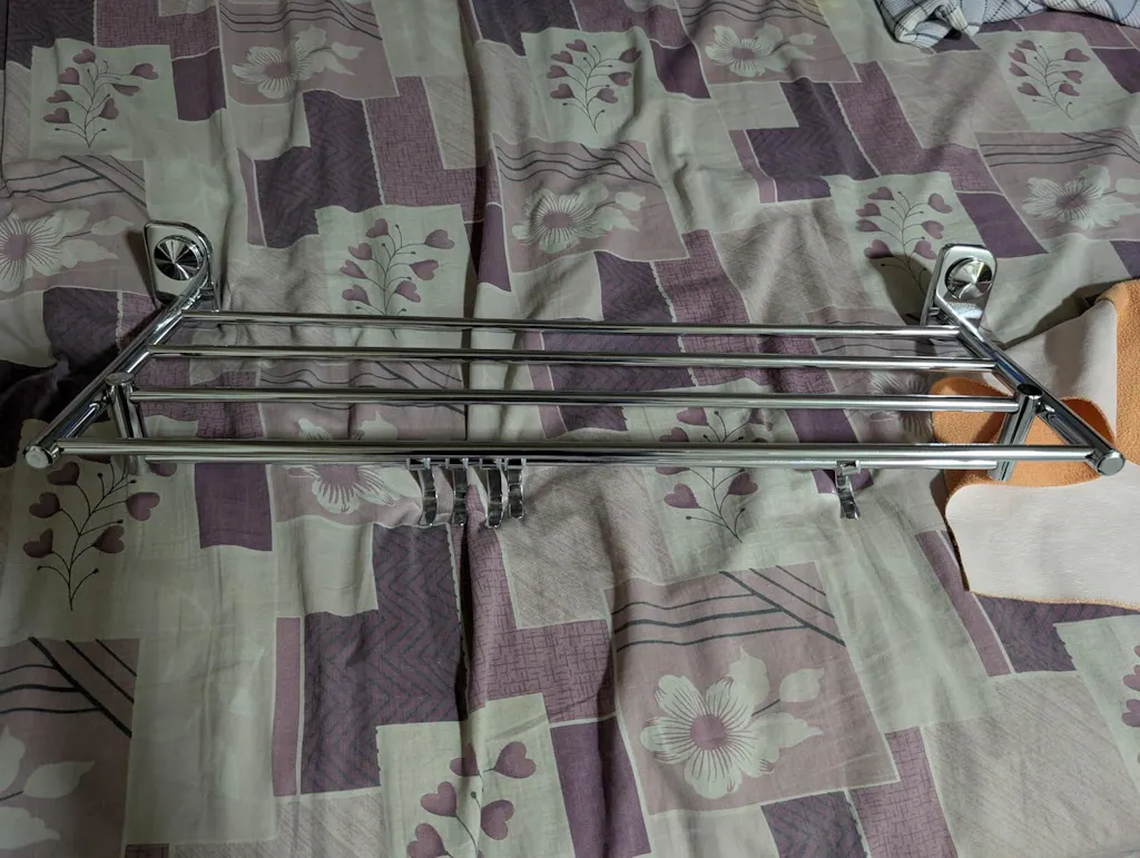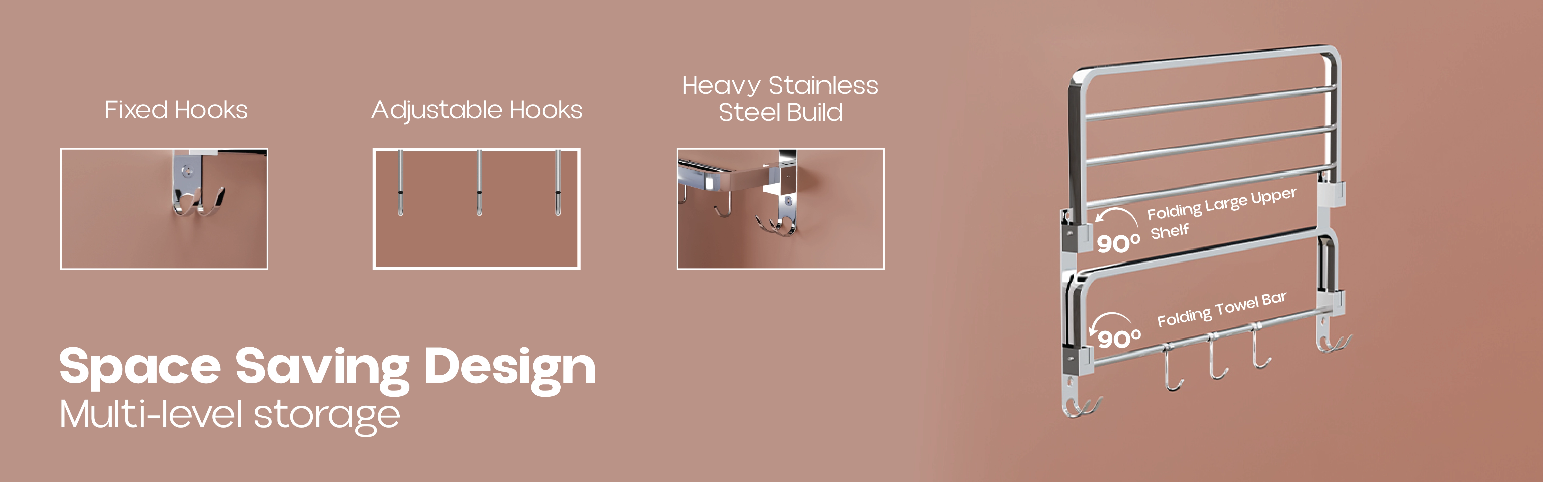 A perfect blend of style and functionality, with double decks for keeping clothes and towels, designed to enhance your bathroom's aesthetic while offering practical use. Crafted from high-quality grade stainless steel, this towel rack ensures long-lasting durability and corrosion resistance, ideal for all types of bathroom fittings. With multiple rods and hooks, this versatile towel rack for bathroom allows you to organize towels, clothes and other bathroom accessories with ease. The foldable shelves provides a space-saving feature and the installation is made effortless with the included wall mounting kit.