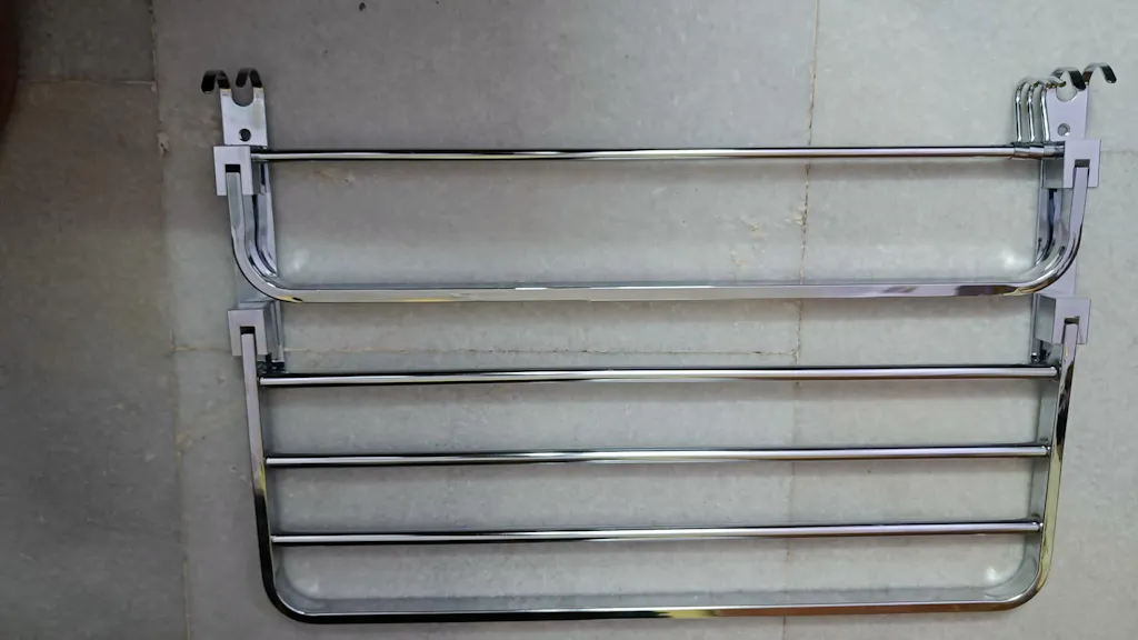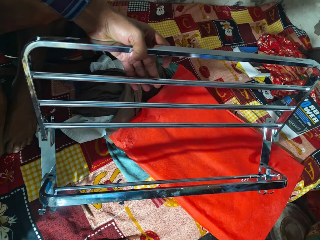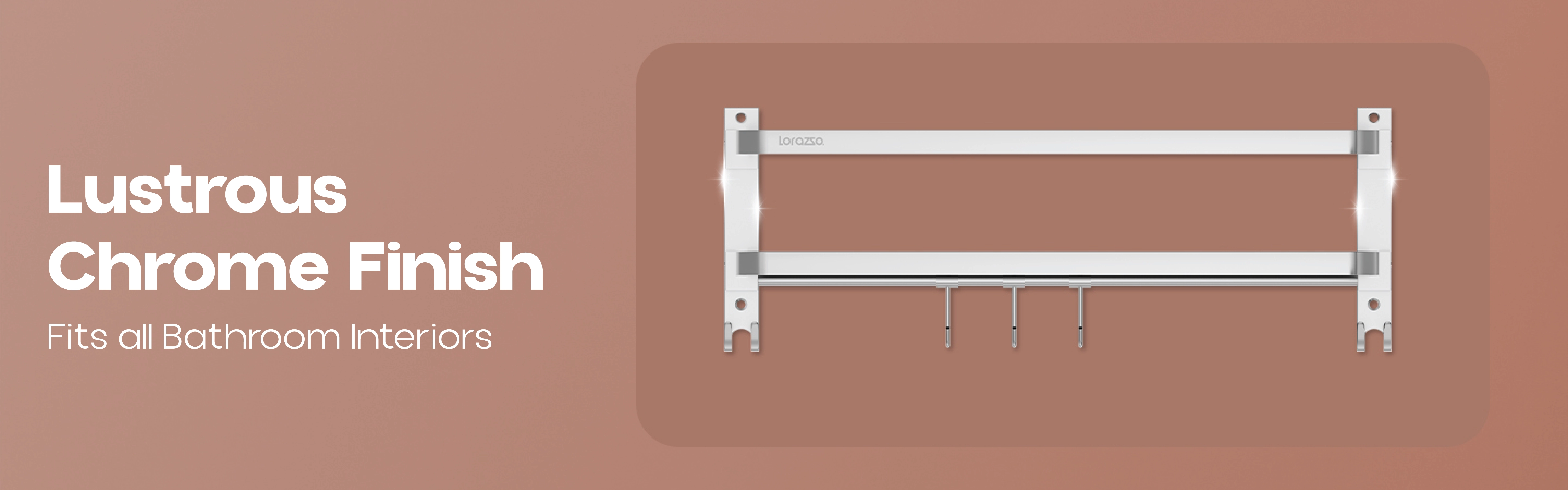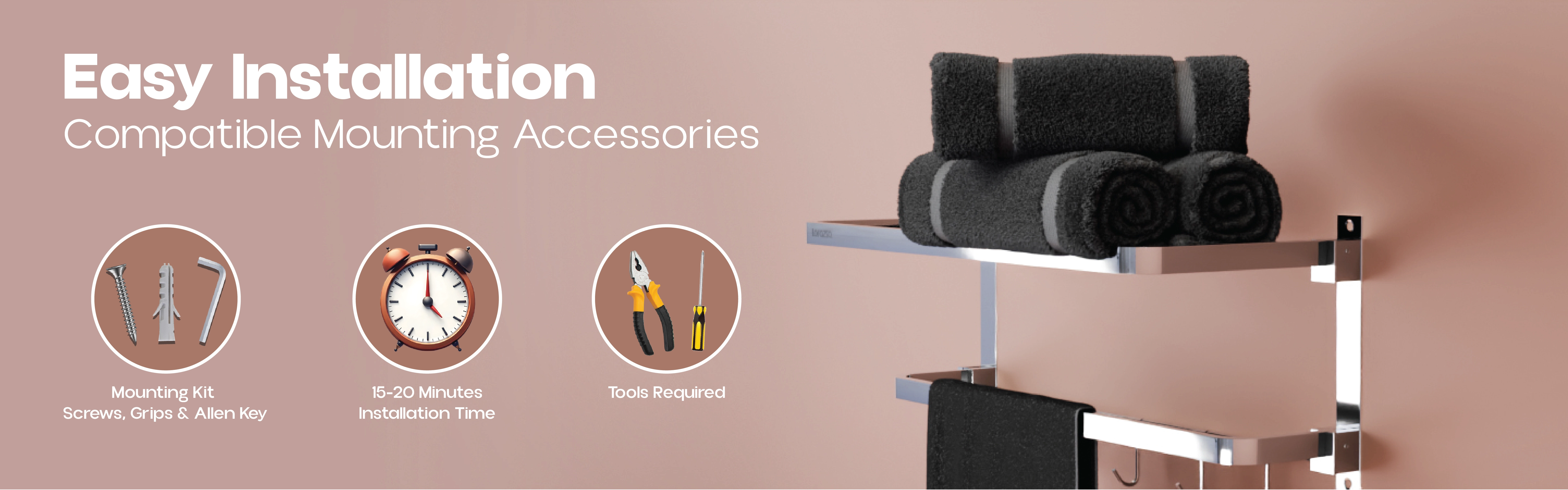 A perfect blend of style and functionality, with double decks for keeping clothes and towels, designed to enhance your bathroom's aesthetic while offering practical use. Crafted from high-quality grade stainless steel, this towel rack ensures long-lasting durability and corrosion resistance, ideal for all types of bathroom fittings. With multiple rods and hooks, this versatile towel rack for bathroom allows you to organize towels, clothes and other bathroom accessories with ease. The foldable shelves provides a space-saving feature and the installation is made effortless with the included wall mounting kit.